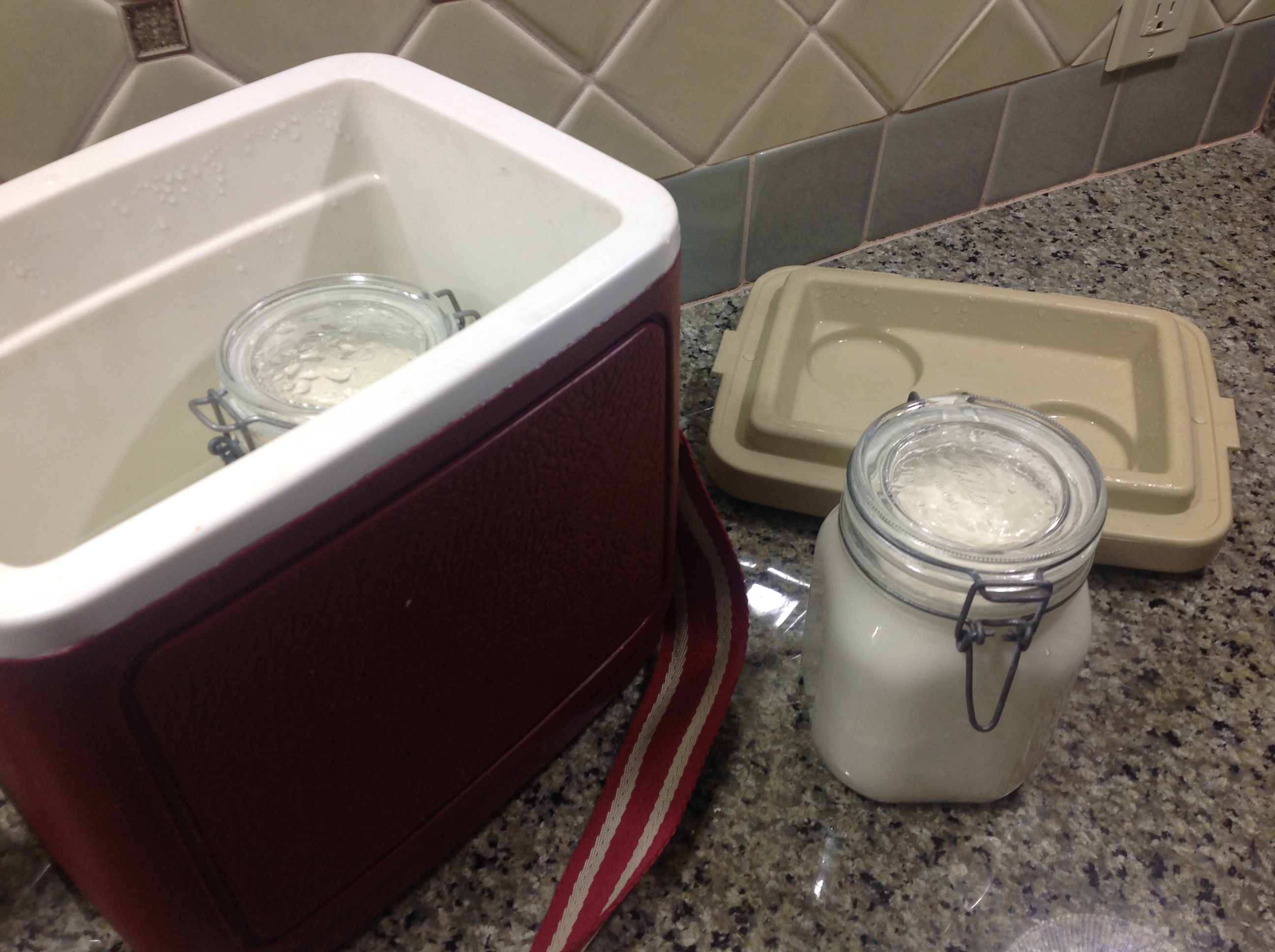 Dump almost all the water out of the cooler. You want enough left to immerse the mason jars into without it coming up to the lips of the jars (otherwise as they cool they may suck water into the yogurt. Yuck.)